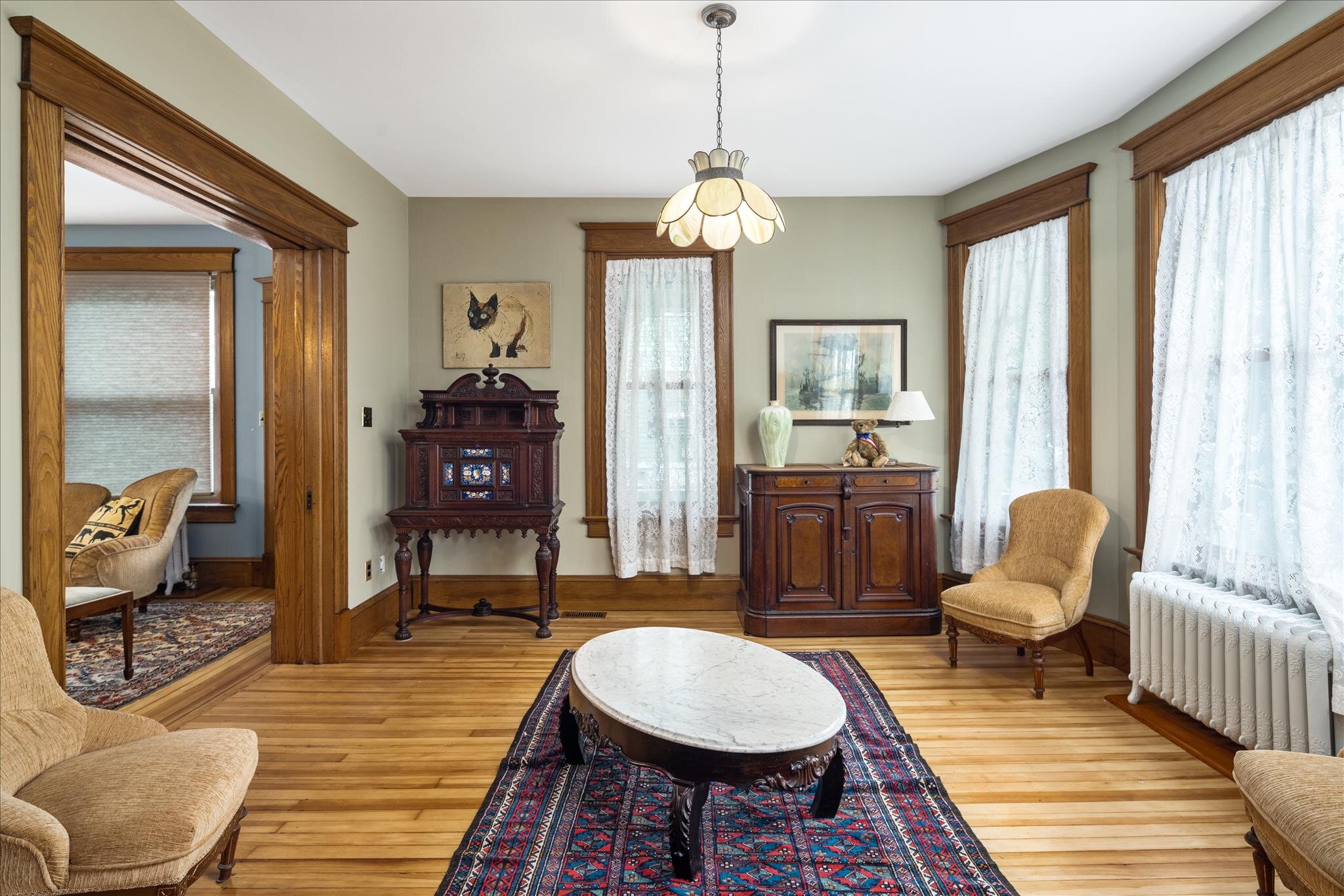 A grand Hightstown home. Live in the luxury and detail of 1895, with all the comforts of 2021. Walk to downtown from this restored Victorian with a double parlor, pocket door and both a main and a back staircase. Original woodwork and floors , meticulously refinished. Premium walnut kitchen with center island, and wood burning fireplace. Extra large main bath, with Turkish tile and soaking tub. Third floor full bath has clawfoot tub and mosaics. Powder room off kitchen. Columned interior with pocket doors between front and back parlors. Extra large windows. Wrap around porch has two stairs and two doors. The third floor has been refinished for use as an office, playroom entertainment center or all of the above. Custom Mahogany handrail and engineered hardwood flooring. under a soaring ceiling. The bath with mosaics and clawfoot tub overlooks the extensive backyard. Situated on 1/3 of an acre with soaring oaks trees. Spray foam insulation, two-zone air conditioning with heat pumps. Steam furnace supplies restored Victorian radiators. All electric and plumbing replaced 2016/17. Mature yard with towering oak trees, peach trees, blueberries and strawberries. Flowering bulbs, shrubs and bushes provide color all season. and holly tree provides winter cheer. Low stone walls and wisteria gazebo. Kitchen garden off back porch. Five Bay Barn is 2 1/2 stories. Plenty of Parking and Storage.